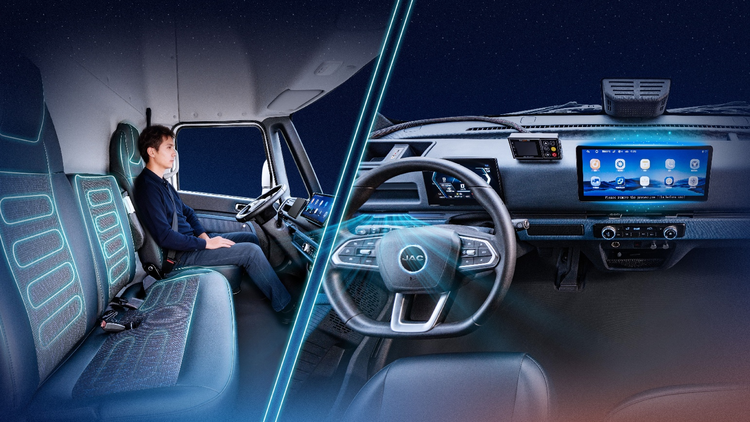 跑快递的小赵身高一米八,以前开别的车,上下车都要弯腰,中午想躺会儿只能蜷着。坤鹏ET9采用行业最宽2170mm高顶平地板驾驶室,内高1米85,地板纯平,他不仅能站直,还能在车里溜达两步,座椅像沙发一样,开一天车腰不酸腿不疼。